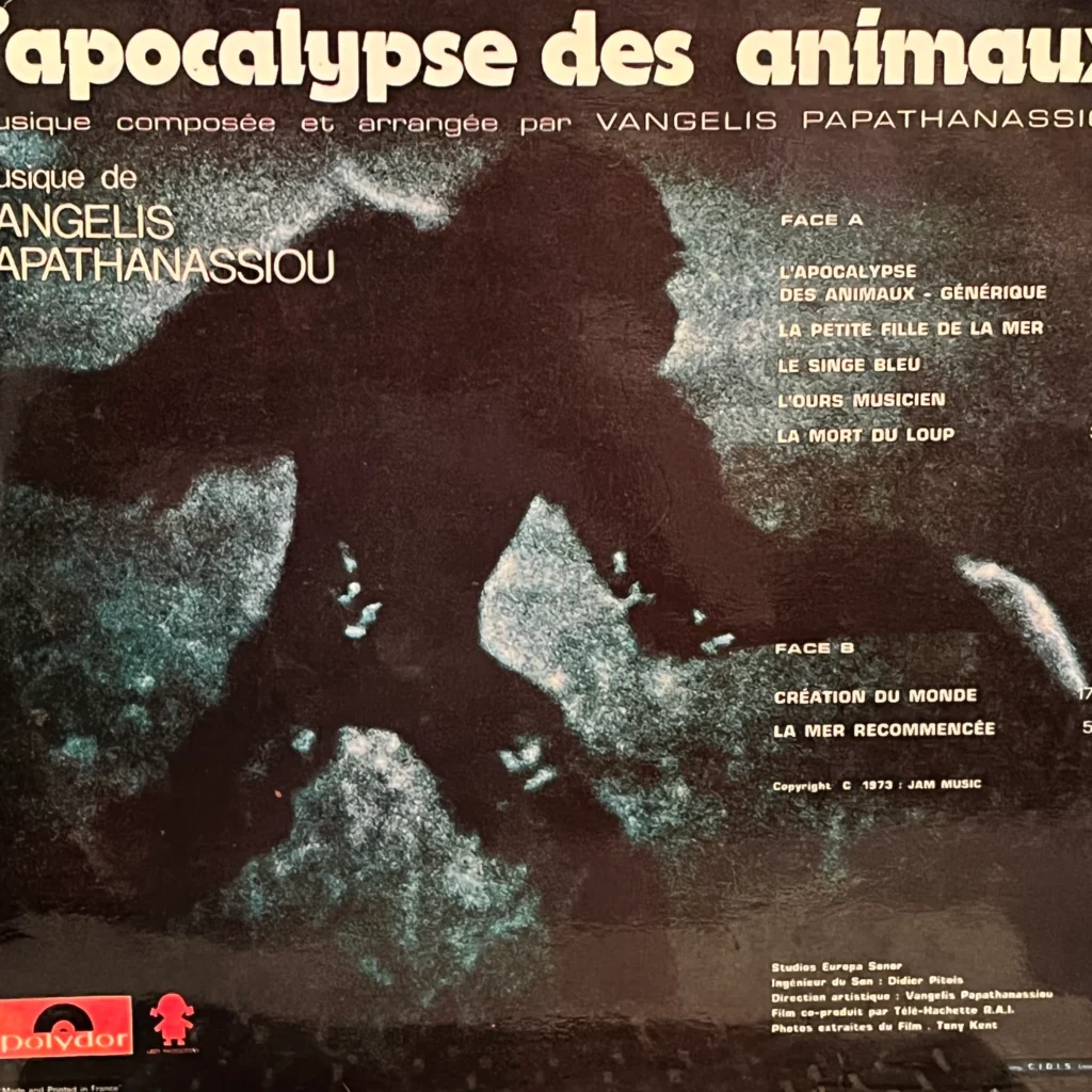 En esta banda sonora de «L’Apocalypse des Animaux» tenemos una mixtura de electrónica clásica -órgano eléctrico, sintetizadores analógicos rudimentarios, percusiones suaves- mezclado con instrumentos acústicos como guitarra y trompeta, claras influencias de su estadía en el hijo de Afrodita.